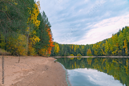 The watermark will not be included on Wall mural.: Panoramic view of the bright colorful trees along the bank of the kama river russia perm krai - autum