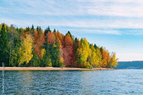 The watermark will not be included on Wall mural.: Panoramic view of the bright colorful trees along the bank of the kama river russia perm krai - autum