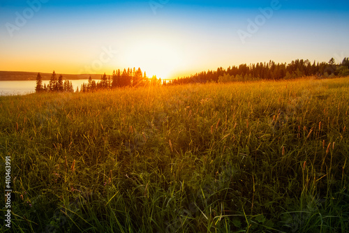 Wall mural panoramic view of the kama river from the hill, green meadow, rural road, sunset sky and sun rays. - Wall murals Wall mural panoramic view of the kama river from the hill, green meadow, rural road, sunset sky and sun rays. - Wall murals