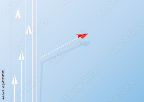 Wall mural paper airplanes flying on blue sky and cloud.paper art style of business teamwork and one different