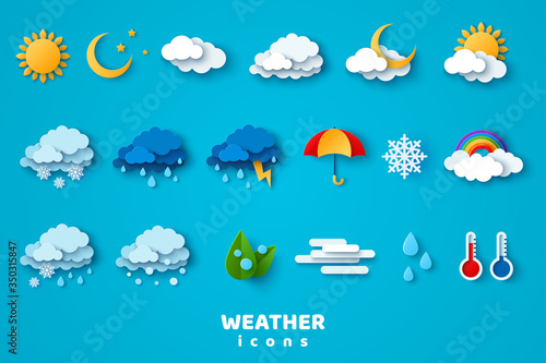The watermark will not be included on Wall mural.: Paper cut weather icons set on blue background - vector illustration - white clouds, dew on leaves, fo