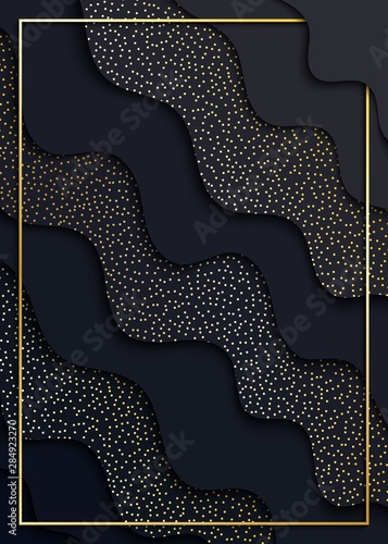 Wall mural papercut abstract wave black shape background with gold dots and frame pattern. layered backdrop wit