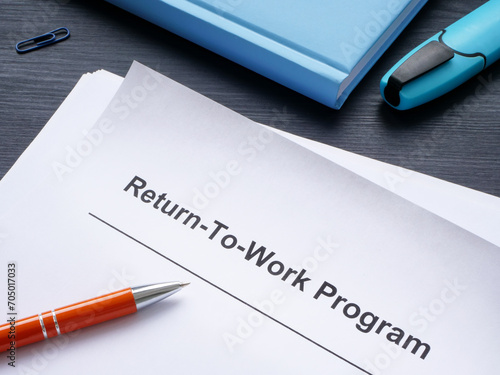 The watermark will not be included on Wall mural.: Papers with return-to-work program and pen -