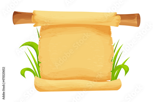 Wall mural : Parchment scroll on bamboo stick with grass in cartoon style isolated on white background - game asse