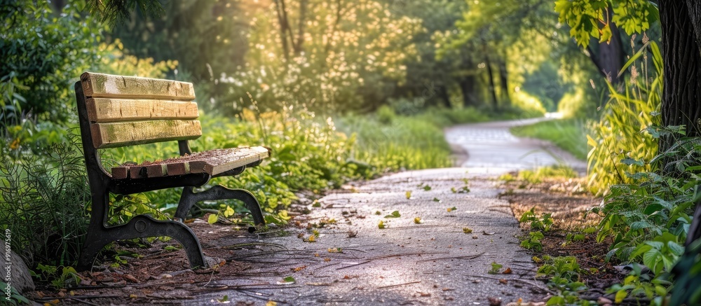 The watermark will not be included on Wall mural.: Park bench on a pathway with a copy space image