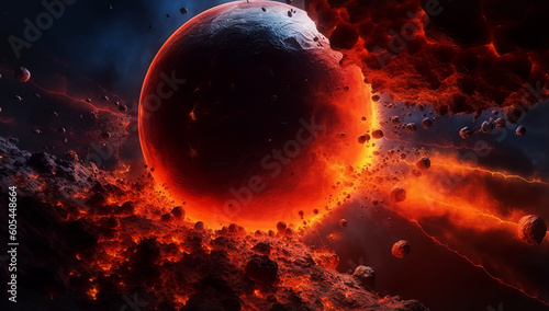 Wall mural particles fall on the surface of a fantastic planet. particle explosion, fiery lava. generative ai - Wall murals Wall mural particles fall on the surface of a fantastic planet. particle explosion, fiery lava. generative ai - Wall murals
