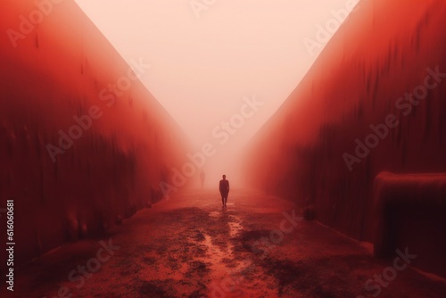 The watermark will not be included on Wall mural.: Passage through hell into the heaven in the distance surreal red tones with mist generative ai