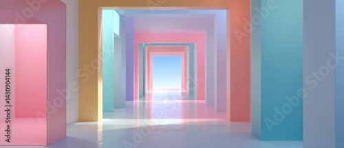 The watermark will not be included on Wall mural.: Pastel colored corridor with repeating arches and sky view, creating a dreamy and surreal architectu