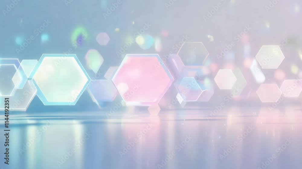 The watermark will not be included on Wall mural.: Pastel-colored hexagonal shapes hover above a reflective surface, creating a futuristic and technolo