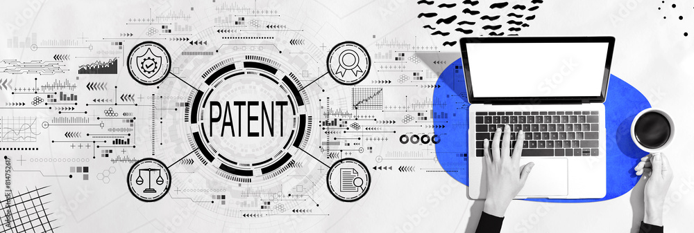 The watermark will not be included on Wall mural.: Patent concept with person using a laptop computer
