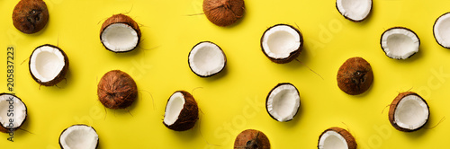 Wall mural pattern with ripe coconuts on yellow background. top view. copy space. pop art design, creative summ