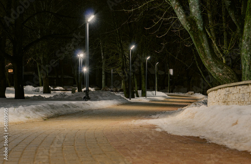 The watermark will not be included on Wall mural.: Paving stone path in the park at the evening and lantern lights - winter