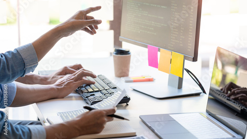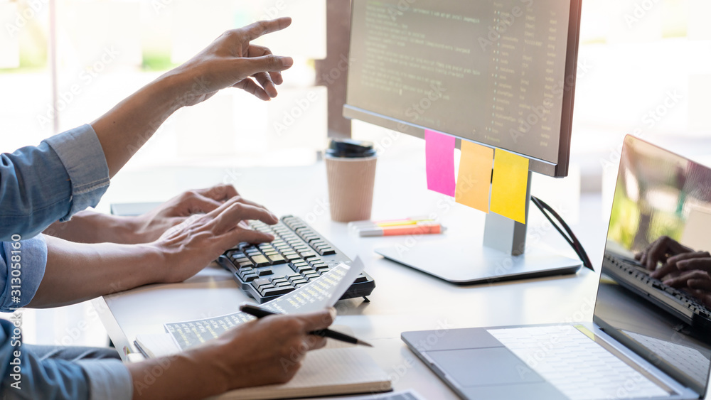 The watermark will not be included on Wall mural.: Pensive programmer working on on desktop pc programming code technologies or website design at offic