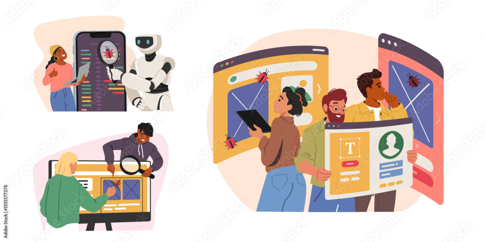 Wall mural people and artificial intelligence program bot providing software testing, fixing hardware bugs set - Wall murals Wall mural people and artificial intelligence program bot providing software testing, fixing hardware bugs set - Wall murals