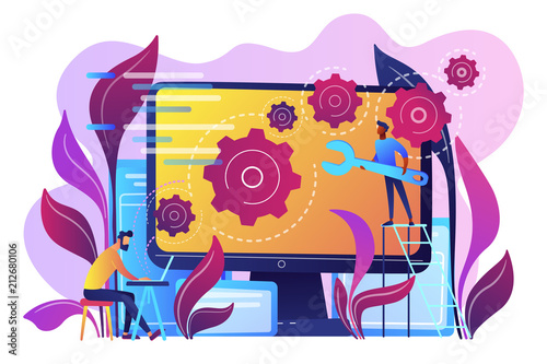 Wall mural people configure the application on the big lcd screen with gears. back end development it concept.  - Wall murals Wall mural people configure the application on the big lcd screen with gears. back end development it concept. - Wall murals