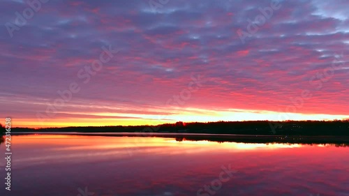 Wall mural perfect slow panning view of tranquil water reflecting sunrise with red clouds and colorful sky. thi