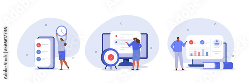 The watermark will not be included on Wall mural.: Performance management illustration set - characters setting goals and objectives to professional dev