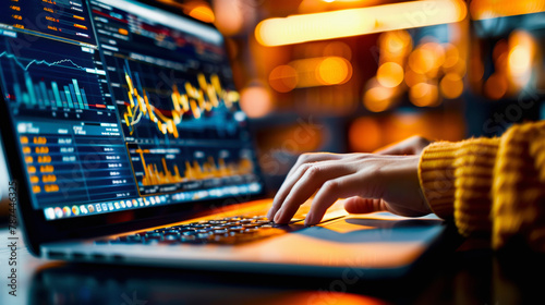 Wall mural : Person analyzing financial data on a laptop with stock market graphs on the screen in a dimly lit wo