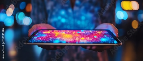 Wall mural : Person holding a tablet displaying vibrant data visualization, representing digital innovation, mode