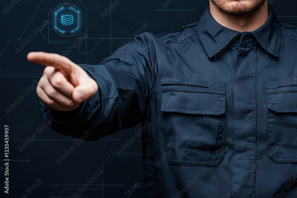 Wall mural person in dark uniform points forward, with digital interface displaying data tokenization symbols i - Wall murals Wall mural person in dark uniform points forward, with digital interface displaying data tokenization symbols i - Wall murals