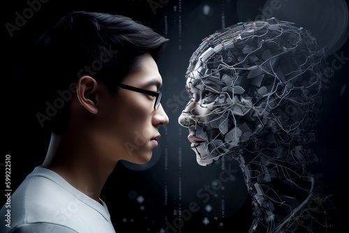 Wall mural person looking at a robotic artificial intelligence version of themselves. deep fake. generative ai - Wall murals Wall mural person looking at a robotic artificial intelligence version of themselves. deep fake. generative ai - Wall murals