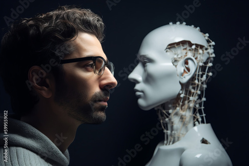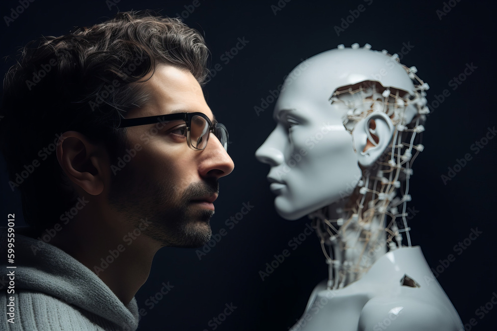 Wall mural person looking at a robotic artificial intelligence version of themselves. deep fake. generative ai - Wall murals Wall mural person looking at a robotic artificial intelligence version of themselves. deep fake. generative ai - Wall murals