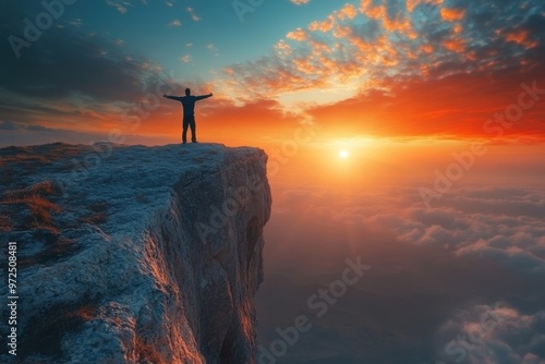 Wall mural person standing at the edge of a cliff with arms outstretched, ready for a new beginning concept. - Wall murals Wall mural person standing at the edge of a cliff with arms outstretched, ready for a new beginning concept. - Wall murals