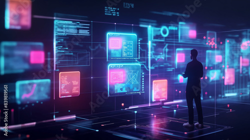 Wall mural person standing in futuristic data monitoring room, digital data management system software technolo - Wall murals Wall mural person standing in futuristic data monitoring room, digital data management system software technolo - Wall murals