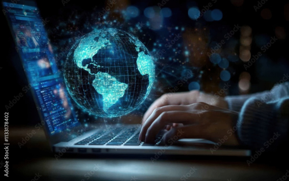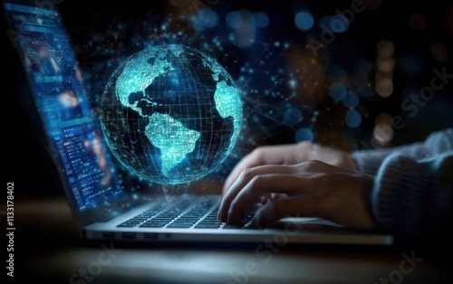 Wall mural person typing on their laptop with digital globe map and global network connection technology in bac - Wall murals Wall mural person typing on their laptop with digital globe map and global network connection technology in bac - Wall murals
