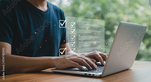 Wall mural : Person using laptop with checklist overlay for task management and productivity enhancement online w