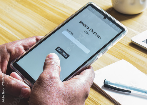 Wall mural : Person using mobile friendly test to analyze the look and performance of his website on the smartpho