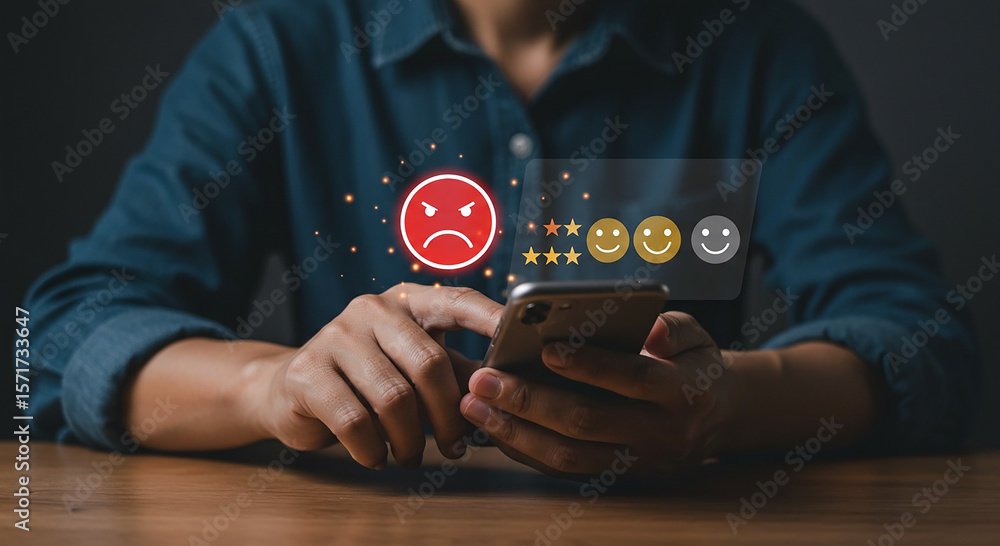 Person using smartphone to give a negative review with an angry face and stars on the screen displayWall mural