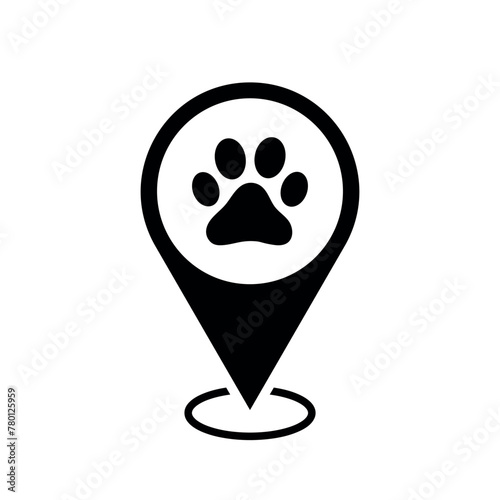 The watermark will not be included on Wall mural.: Pet store location map pointer, dog paw icon with location pin, black symbol isolated on white backg