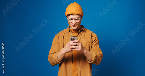 Wall mural : Phone, glasses and scroll with man in studio for social media, networking and connection - mockup spa