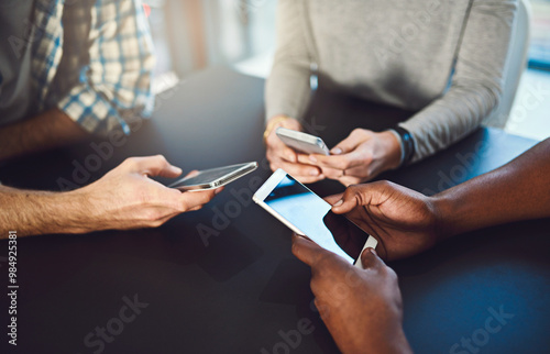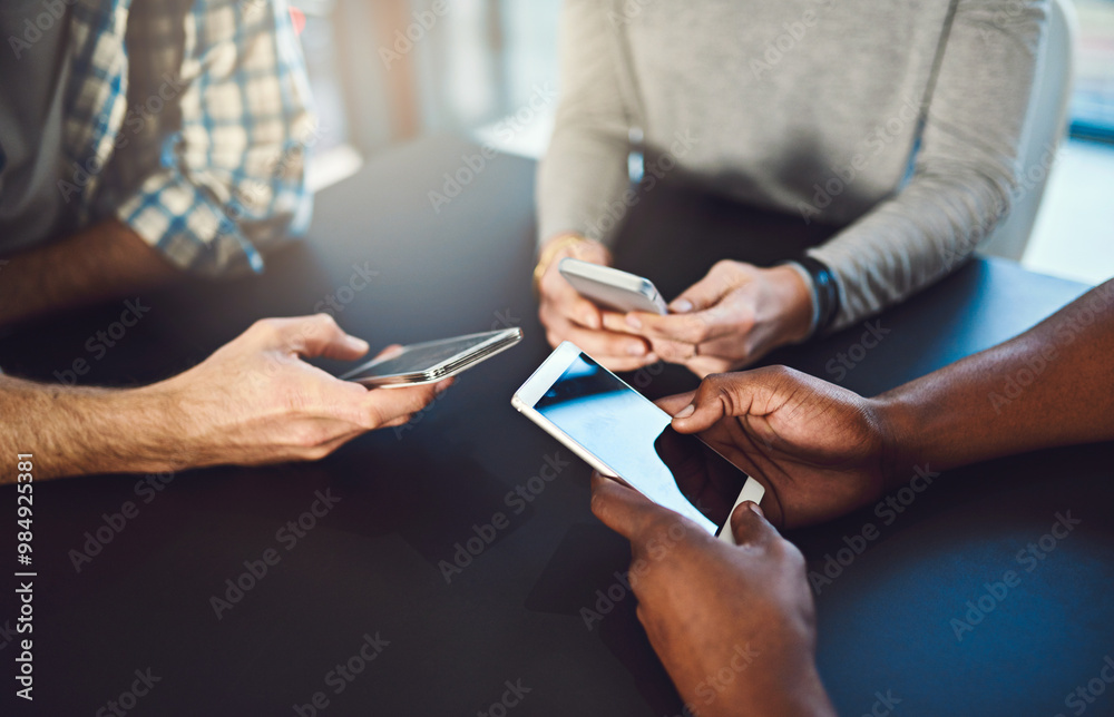 The watermark will not be included on Wall mural.: Phone, hands and people networking in circle for information, notification and online communication -
