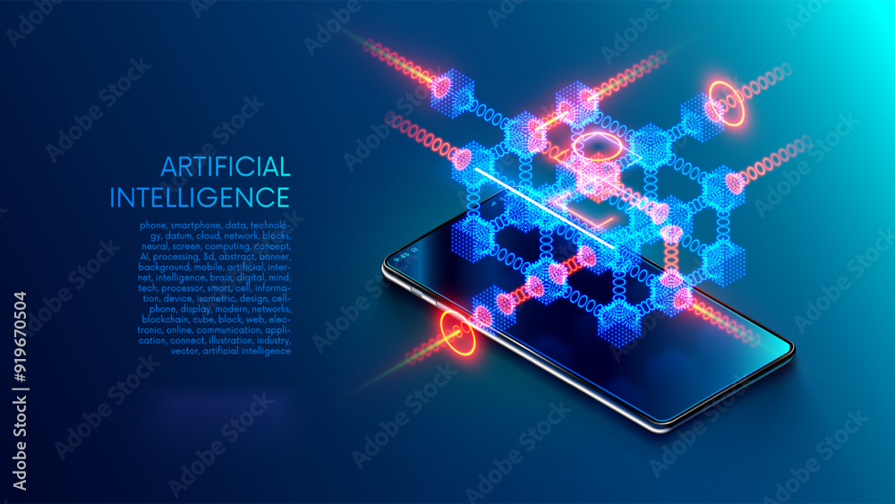 Wall mural phone with abstraction data blocks hanging over screen. neural network or cloud computing concept on