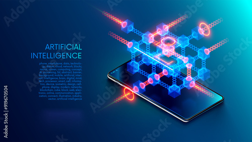 Wall mural : Phone with abstraction data blocks hanging over screen - neural network or cloud computing concept on