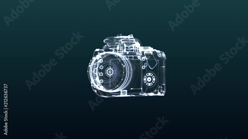 Photo camera being formed by particles - blue abstract futuristic science and technology background - Wall mural