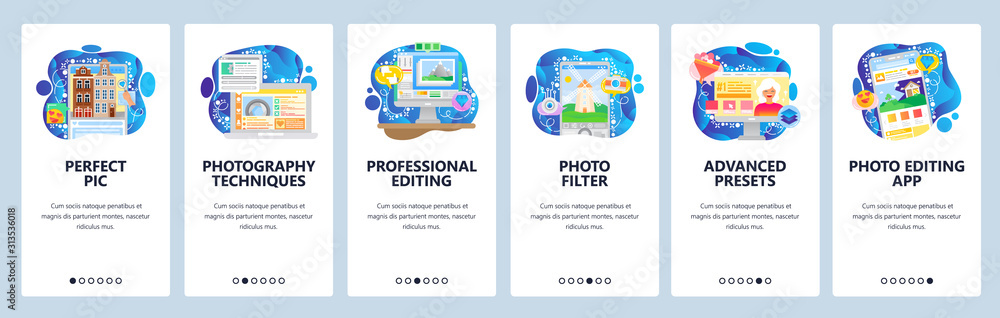 Wall mural photo editor software, smartphone application, photo filter. mobile app onboarding screens. menu vec