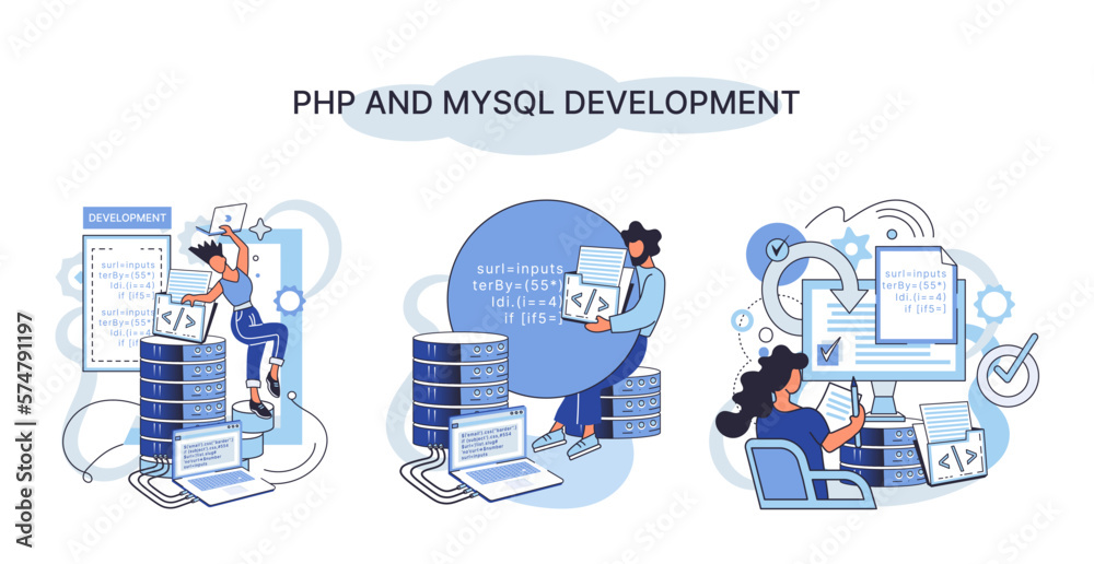 Wall mural php and mysql development metaphor. software website developer with computer, programmer service, op - Wall murals Wall mural php and mysql development metaphor. software website developer with computer, programmer service, op - Wall murals