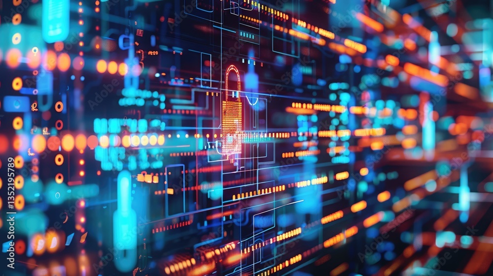 Picture of digital security system to protect dangerous hacking computer user in colorful light of cWall mural