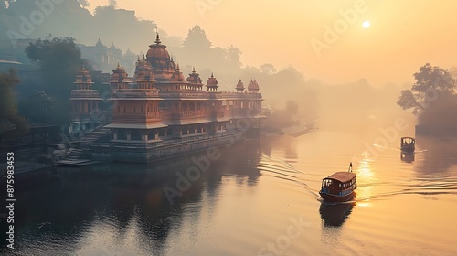 Wall mural picturesque view of an ancient temple with ornate architecture, nestled beside a serene river with a - Wall murals Wall mural picturesque view of an ancient temple with ornate architecture, nestled beside a serene river with a - Wall murals