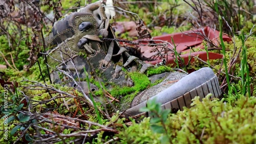 The watermark will not be included on Wall mural.: Pile of trash left in a forest clearing, illustrating the problem of littering and environmental pol