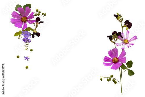 The watermark will not be included on Wall mural.: Pink, purple flowers cosmos local flora arrangement flat lay postcard style