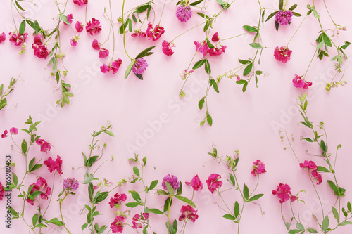 Wall mural pink flowers on a pink background. abstract floral composition. flower pattern. frame of plants and