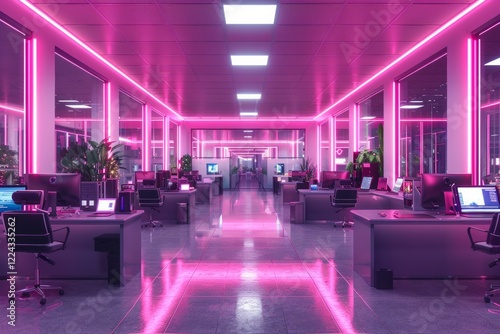 The watermark will not be included on Wall mural.: Pink neon lights illuminate an empty office with computers and chairs - ai generative - -