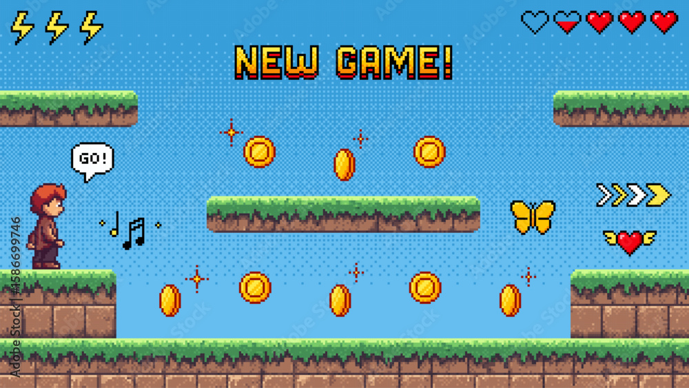 Wall mural pixel art game level vector with a young boy character and "new game" text for gaming and entertainm - Wall murals Wall mural pixel art game level vector with a young boy character and "new game" text for gaming and entertainm - Wall murals