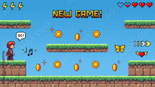 The watermark will not be included on Wall mural.: Pixel art game level vector with a young boy character and "new game" text for gaming and entertainm