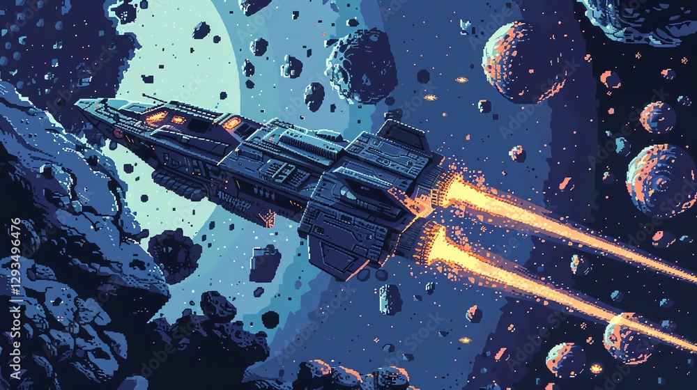 The watermark will not be included on Wall mural.: Pixel art of spaceships flying through an asteroid field -