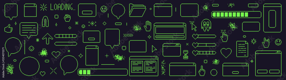 Wall mural pixel art retro windows interface. 8 bit text boxes with loading, cursors, arrow. green stroke conso